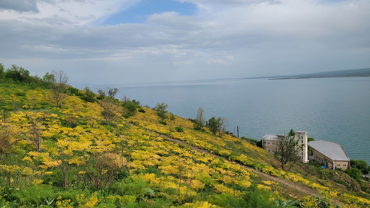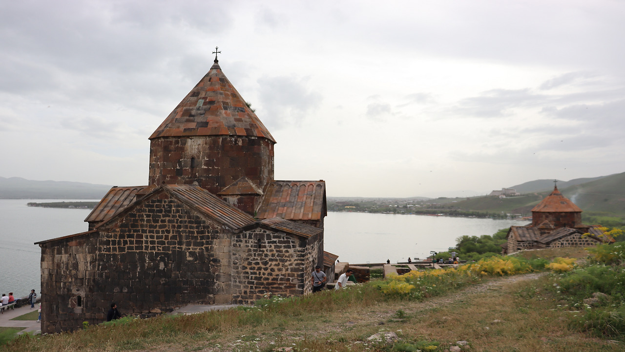 ▼ 언덕에서 내려다본 수도원 풍경. 들꽃에 파묻히다시피 한 수도원이 세반호수를 배경삼아 한 폭의 잘 그린 풍경화로 그려진다. 참고로 ‘세반’은 ‘검은(Sev, 아르메니아어)’과 ‘반(van, 튀르키예 남동쪽에 위치한 호수)’의 합성어라고 한다. 예전에는 튀르키예의 동부지역도 아르메니아 영토였다고 한다. 그곳에 ‘반(van)’이라는 호수가 있는데, 호수 근처에서 살던 아르메니아인들이 이런저런 이유로 이곳으로 옮겨왔던 모양이다. 그리고 검은 빛을 띠는 저 호수에 ‘반 호수’를 겹쳐보면서 향수병을 달랬다는 것이다.