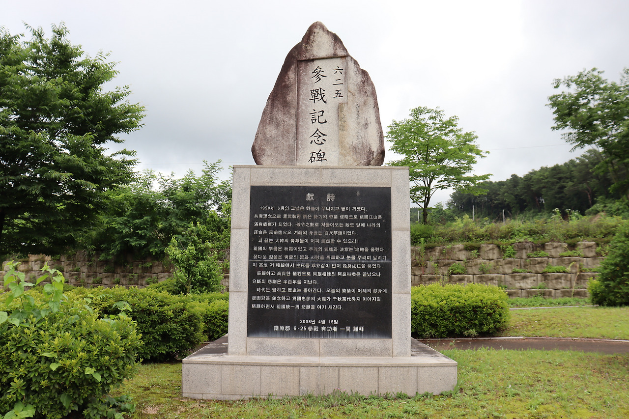 ▼ 6·25 참전기념비. 1950년 6월의 그날은 하늘이 무너지고 땅이 꺼졌다. 공산이념으로 중무장한 붉은 세력의 기습침략으로 조국강산은 만신창이가 되었다. 파죽지세로 쳐들어오는 적도 앞에 나라의 운명은 풍전등화요. 겨레의 신세는 백척간두이었다. 피 끓는 대한의 청년들이 어찌 초연할 수 있으랴! 조국의 부름은 추상이었고 우리의 기백과 의지는 지축을 울렸다. 시대는 변하고 역사는 돌아간다. 하지만 오늘의 번영이 어제의 헌신에 기인하고 있음을 결코 잊어서는 안 된다.