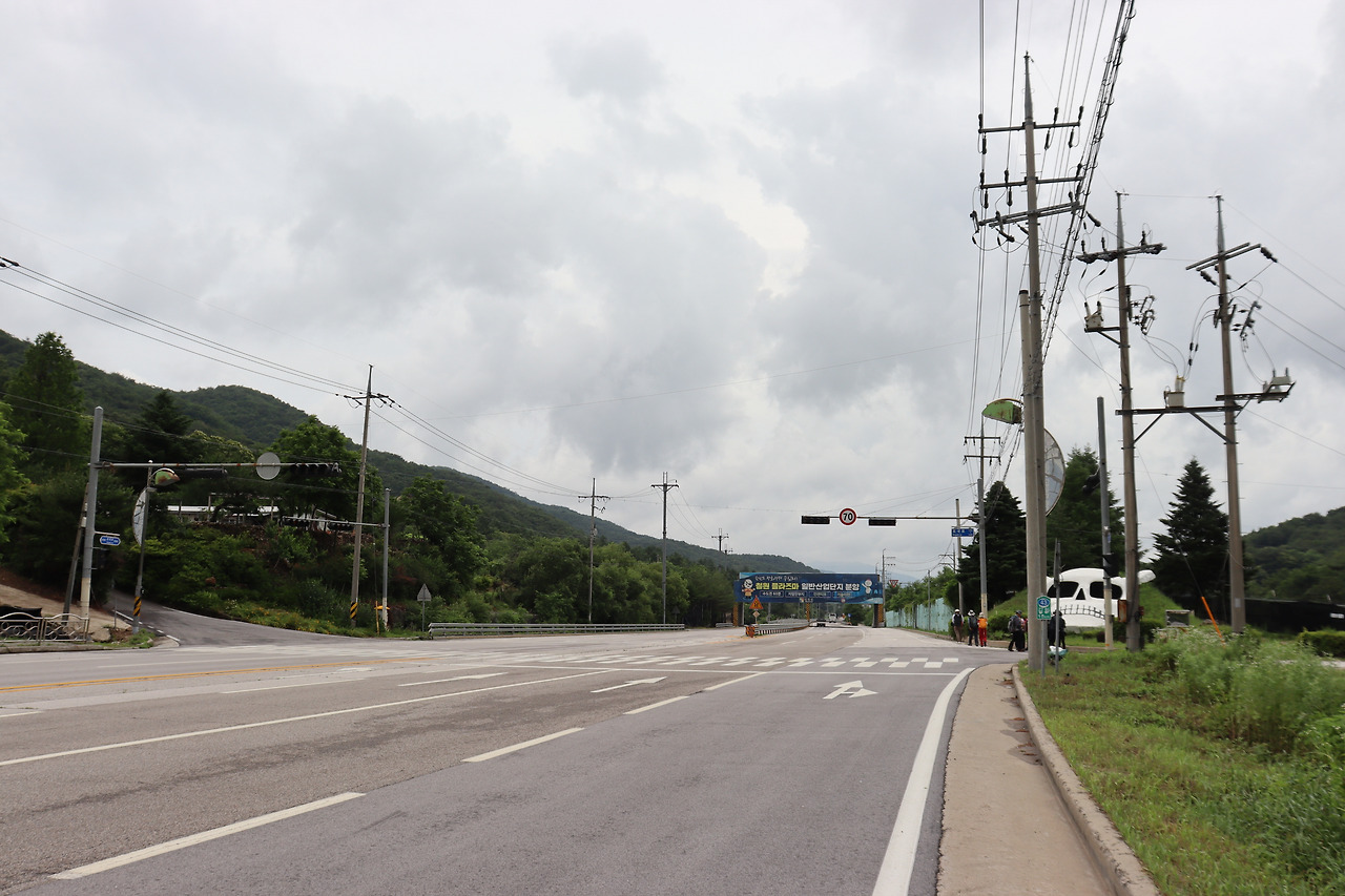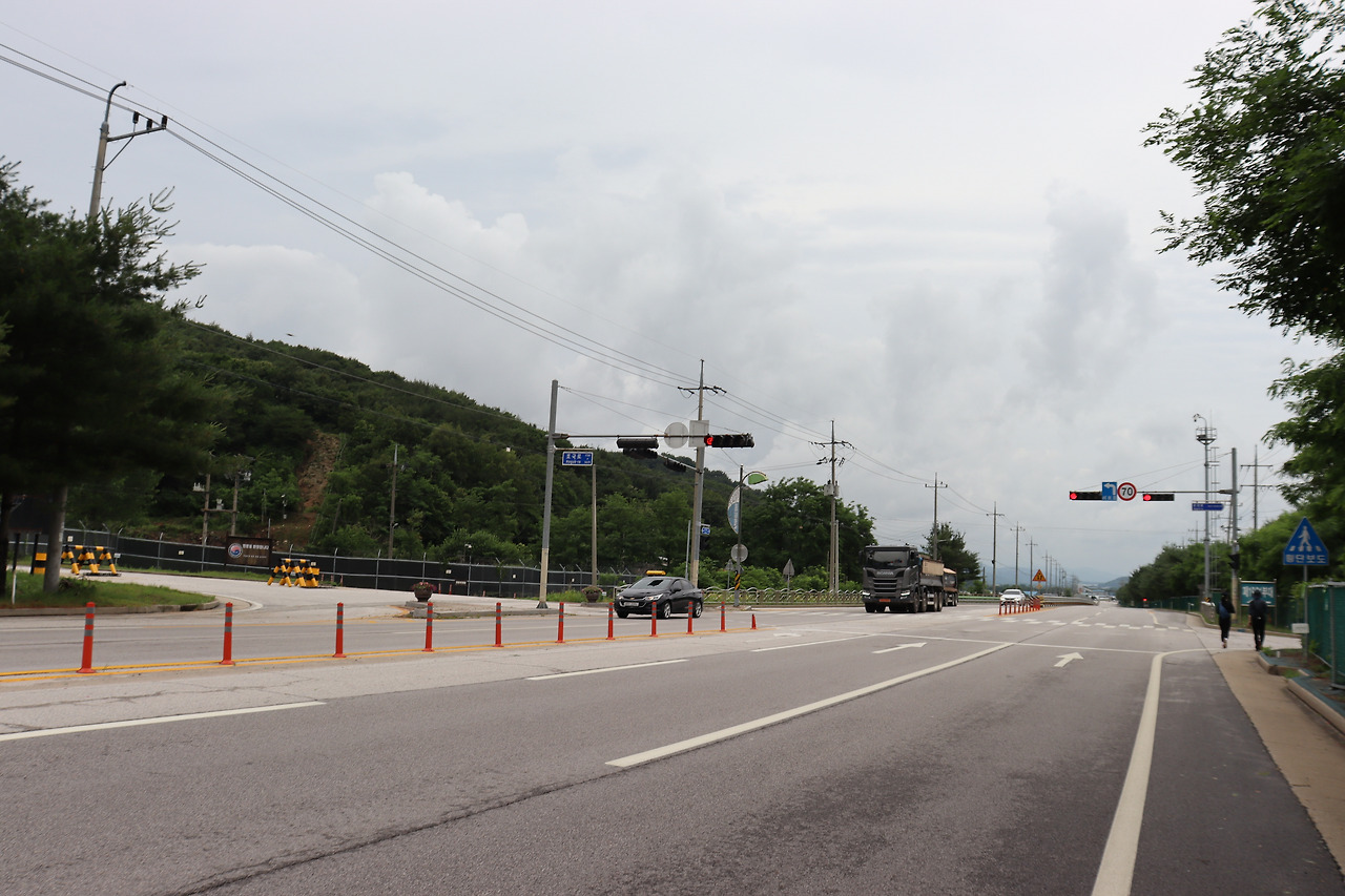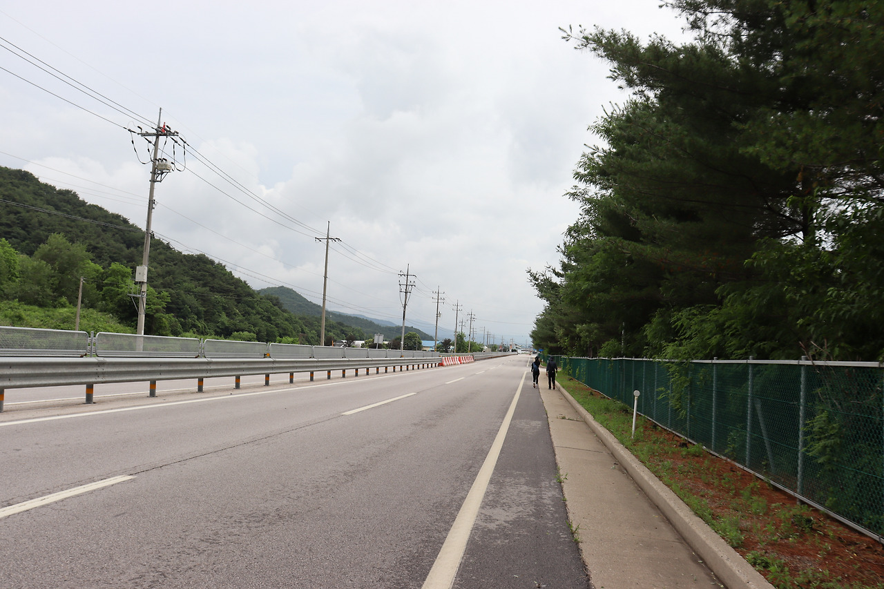 ▼ 이후부터는 4차선인 ‘호국로(국도 43호선)’를 따라간다. 길이 널찍해서인지 오가는 차량들이 하나같이 씽씽 달려댄다. 그런데도 흰색 페인트선 하나로 차도와 인도가 구분되어 있을 따름이다. 목숨을 담보로 걸을 수도 있겠다는 얘기다. 한국관광공사에서 버스로 이동하라고 권했던 이유이지 싶다.
