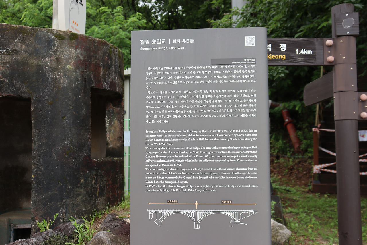 ▼ ‘승일교’는 1948년 8월 북한이 착공하여 1958년 12월 3일에 남한이 완공시킨 다리이다. 시작과 완성의 주체와 시공법이 달라 아치의 크기 등 교각의 모양이 확연하게 구분된다. 인공 치하이던 1948년 북한은 군사도로로 활용하기 위해 한탄강의 남부와 북부지역을 잇는 다리 건설에 착수한다. 설계는 일제 때 진남포 제련소 굴뚝을 설계한 김명여(철원농업전문학교 교사)가 맡아 소련식 유럽공법으로 시공됐다. 당시 철원·김화지역 주민들이 ‘노력공작대’라는 이름으로 강제 동원됐다고 전해진다. 하지만 다리가 절반(2개의 교각 설치)쯤 완성될 즈음 한국전쟁이 발발하면서 공사가 중단됐고, 남쪽 부분은 교각도 없이 덩그러니 남게 됐다. 이후 국군이 임시 목조 가교를 설치했다가 1958년 정부에서 철근콘크리트 구조로 마무리했다. 이로 인해 다리 하나에 두 가지 공법이 혼합된 형태가 되었단다. 분단과 전쟁이 빚어낸 아이러니라고나 할까?