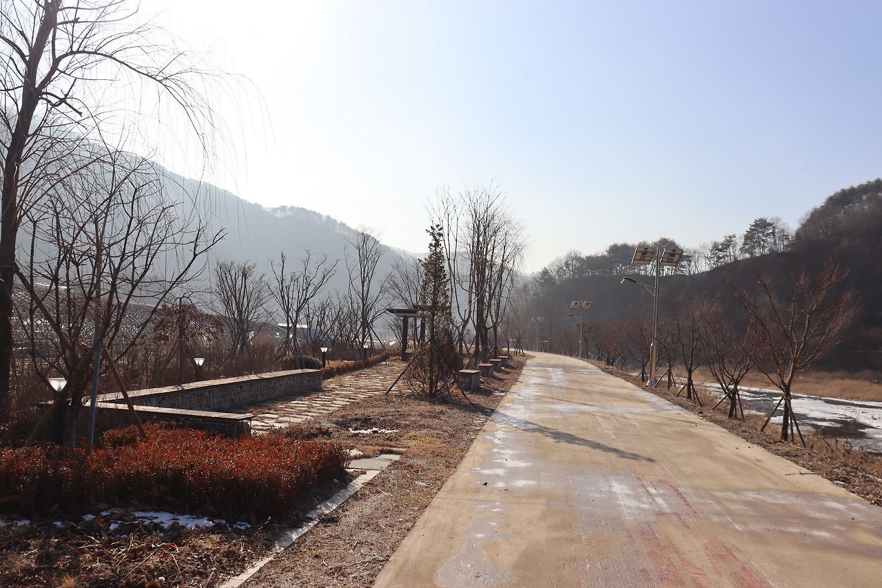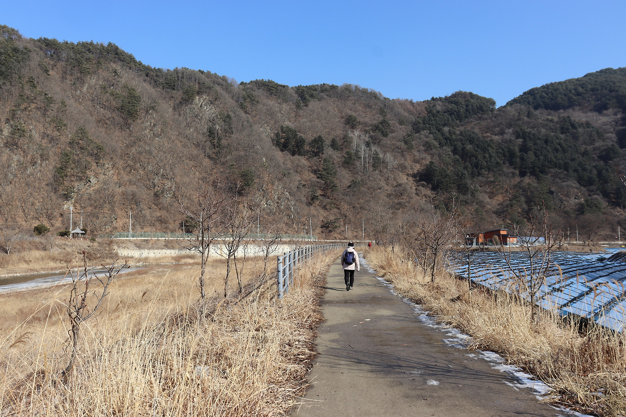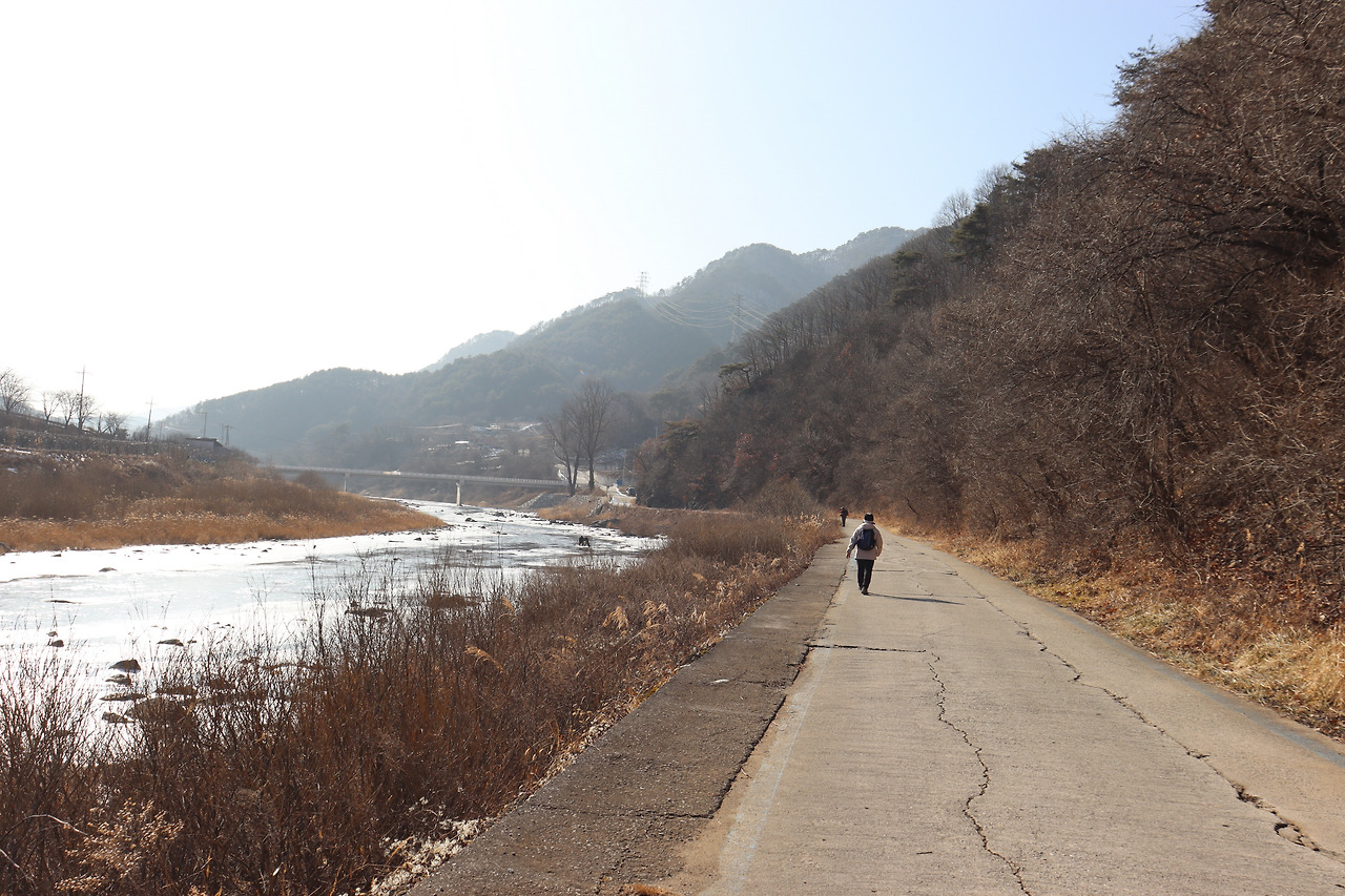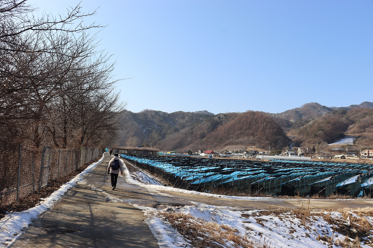 ▼ 또 다시 인북천 둑길을 따라간다. 인삼밭과 인북천 사이로 쭉 뻗은 길을 걸으며, 맑고 시원한 공기를 가슴 깊이 들이켜 본다. 겨울 날씨답지 않게 온화한 기운이 가슴 밑바닥까지 파고든다.