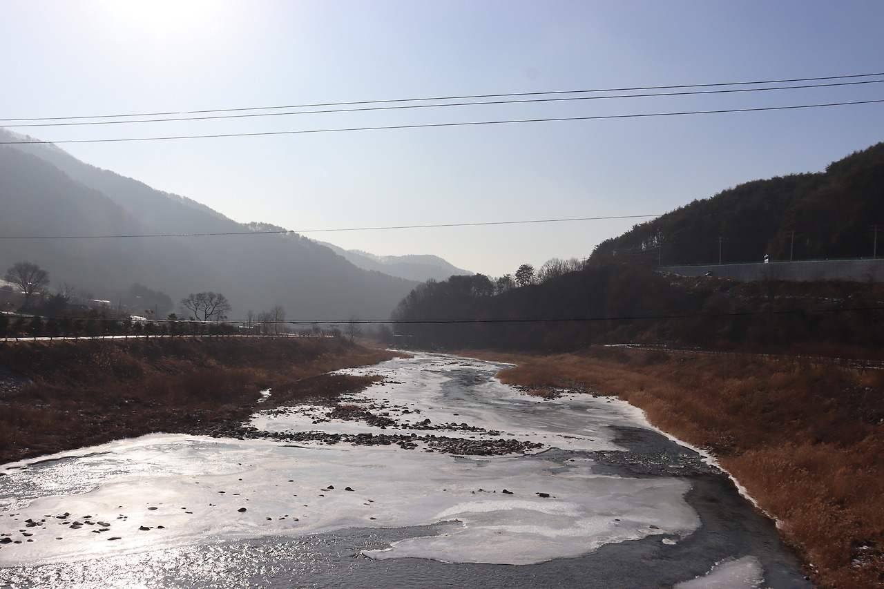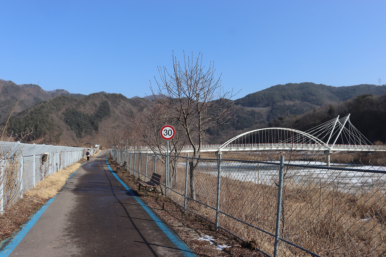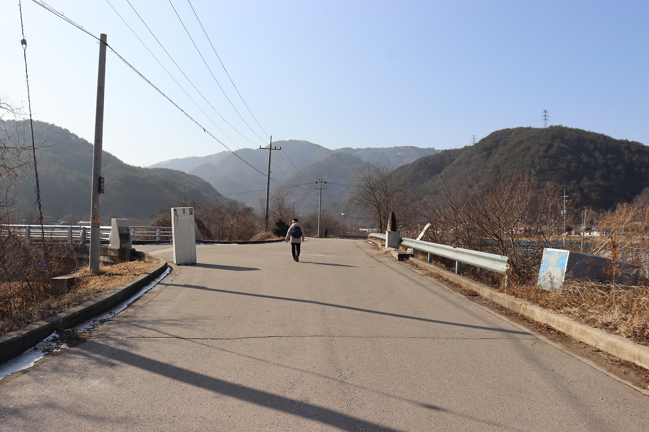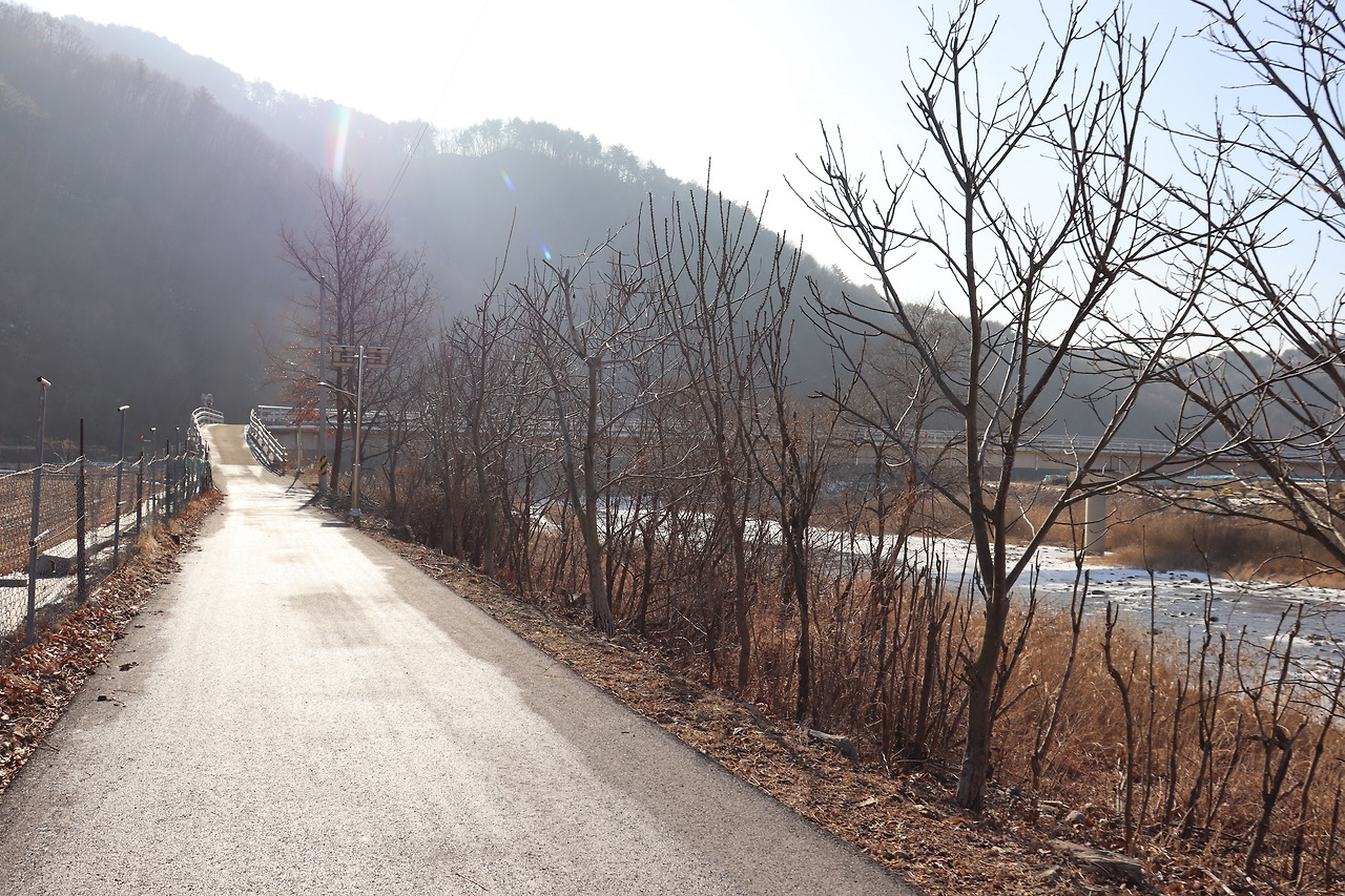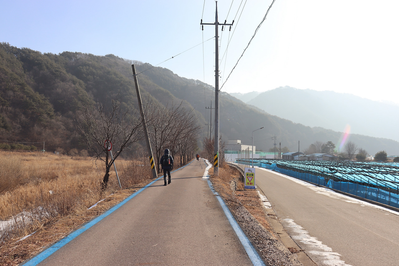 ▼ 또 다시 인북천 둑길을 따라간다. 인삼밭과 인북천 사이로 쭉 뻗은 길을 걸으며, 맑고 시원한 공기를 가슴 깊이 들이켜 본다. 겨울 날씨답지 않게 온화한 기운이 가슴 밑바닥까지 파고든다.