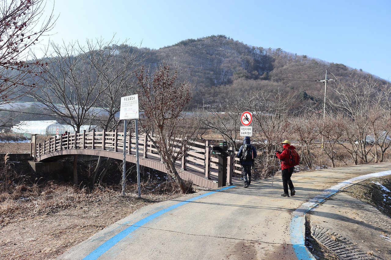 ▼ 강변을 따라 200m쯤 내려갔을까 느닷없이 ‘인북천’ 위로 올라간다. 자전거가 교차할 수 있을 정도의 넓이로 다리를 만들어 놓았다. 허리를 곧추세운 산자락을 피하다보니 어쩔 수 없었나 보다.