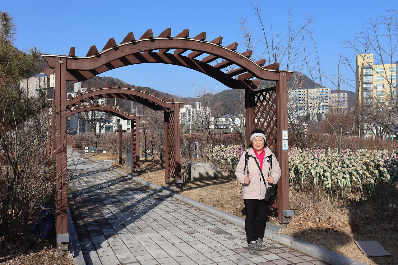 ▼ 14 : 38. 중앙공원에 이르면서 트레킹이 종료된다. 완주 인증 QR코드는 공원 문설주에 붙어있다. 오늘은 17.78km를 4시간 20분에 걸었다. 출발 지점인 논장교에서부터의 거리에다 물빛테마공원을 다녀온 거리와 시간을 더했다.