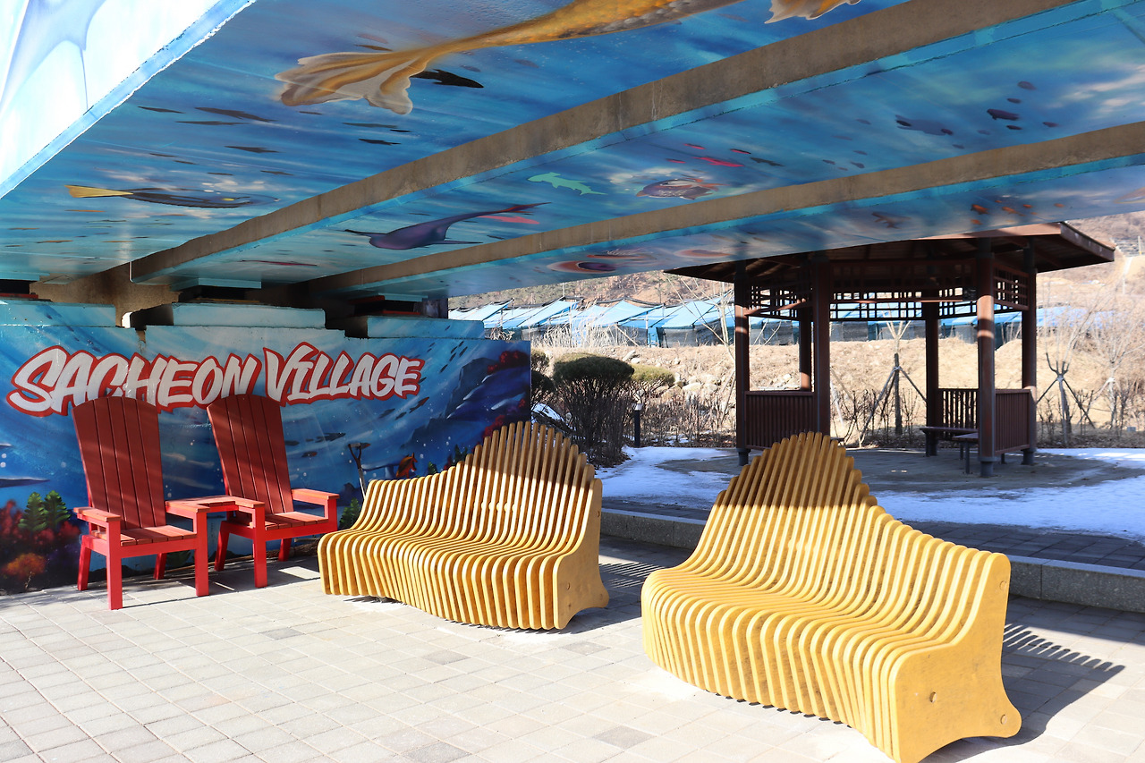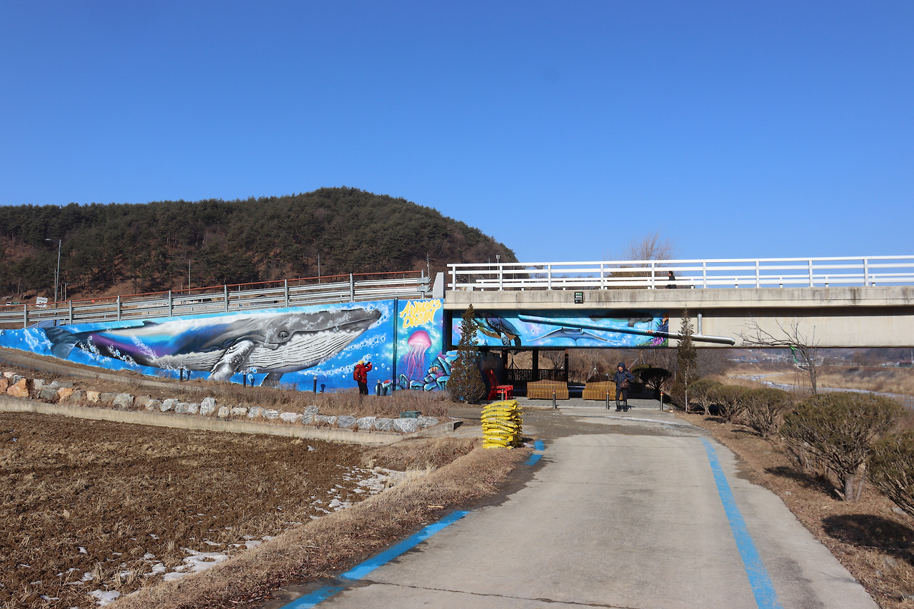 ▼ 다리 서단(西端)은 벽화로 도배되어 있었다. 사천(沙川)은 모래에서 유래된 지명이라고 했다. 상류에서 쓸려온 모래가 유속이 느려지는 이곳에 쌓여 모래톱 지형을 만들었단다. 그런데 뜬금없는 저 ‘고래’는 뭐란 말인가. 벽화의 바탕도 강이 아니라 바다가 분명하다. 설마 우리가 낸 혈세를 장난삼아 써버린 것은 아니겠지?